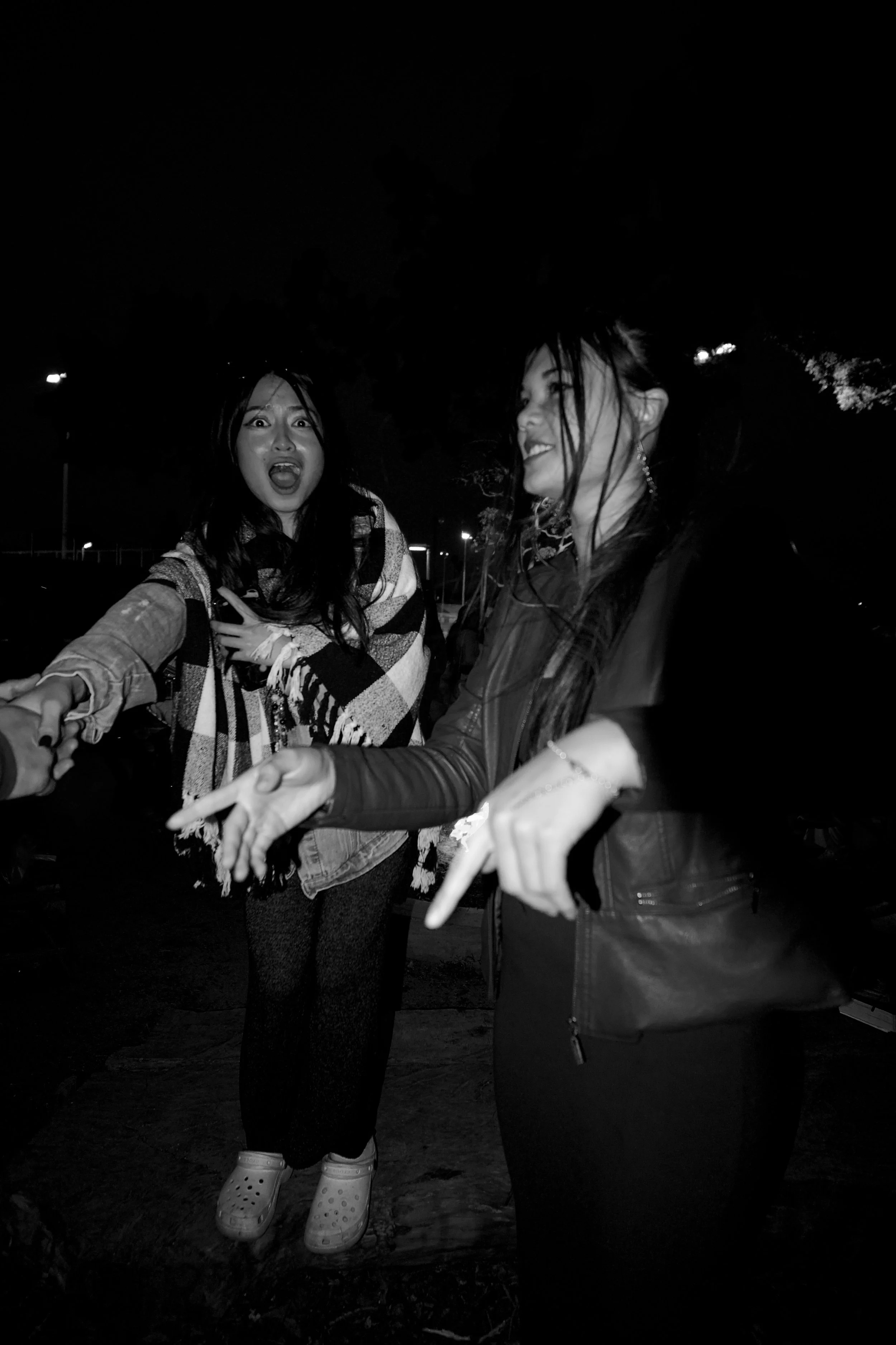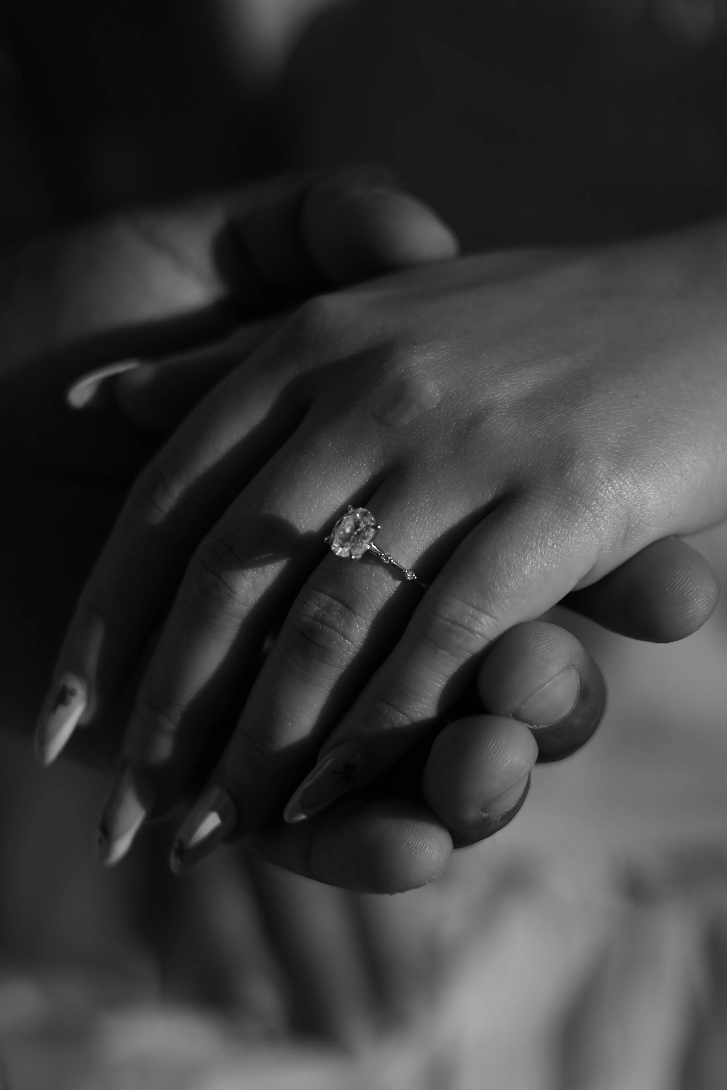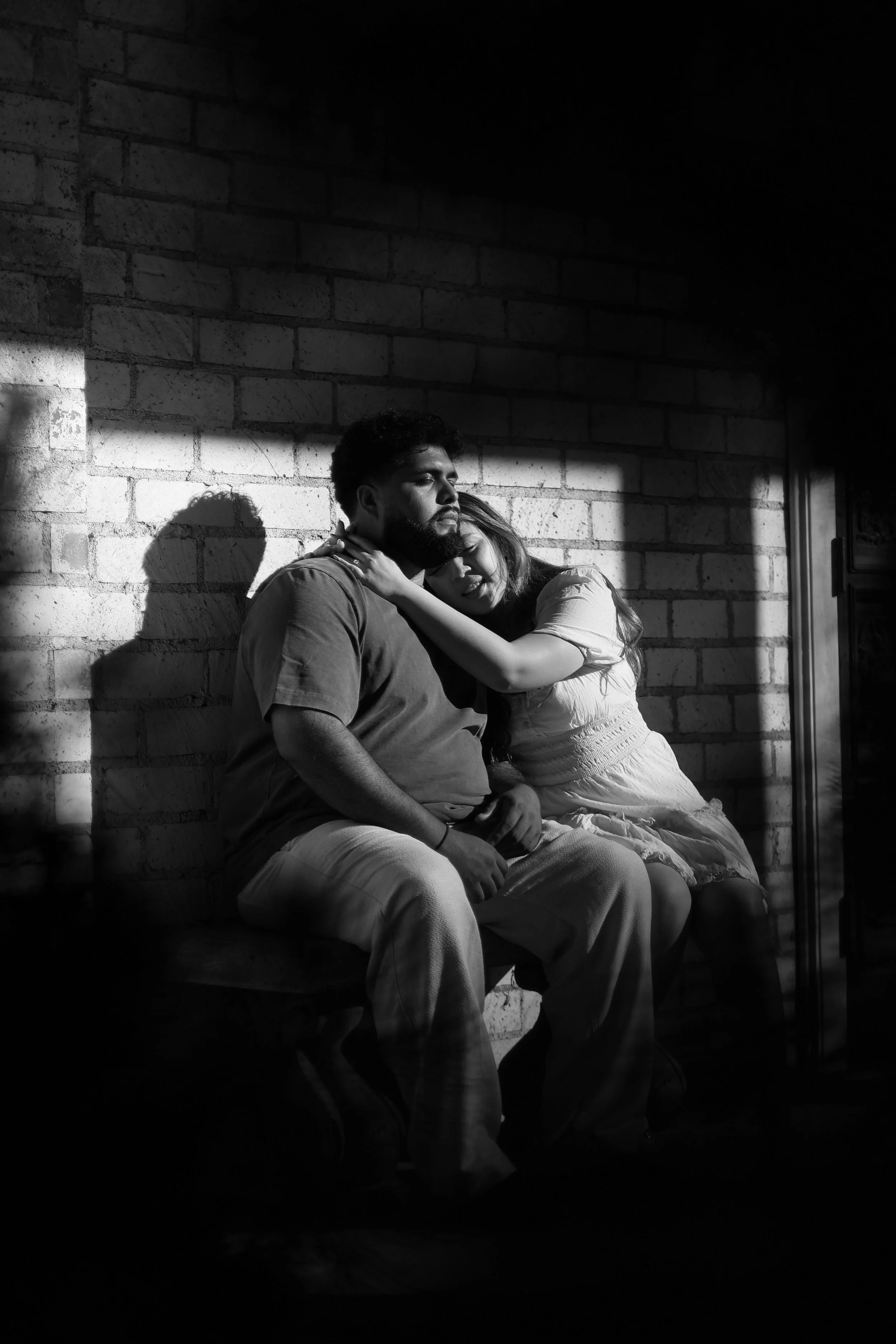 A couple holding hands and touching heads outdoors during sunset with houses and trees in background